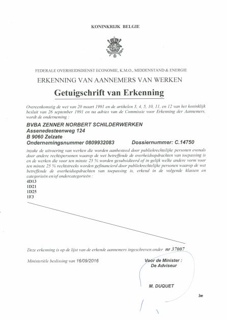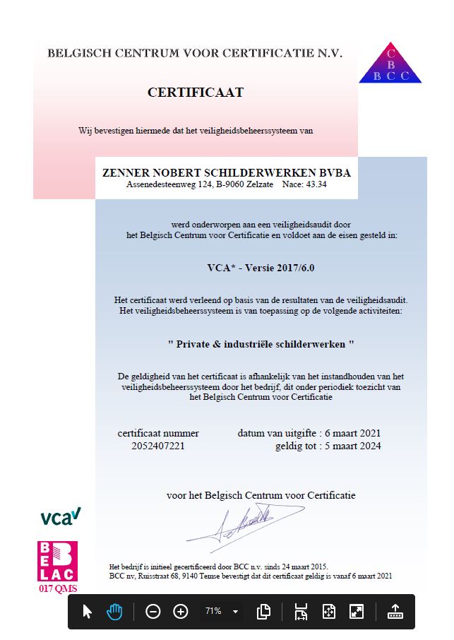 Schilderwerken Zenner Norbert heeft de nodige erkenningen, en is VCA gecertificeerd.